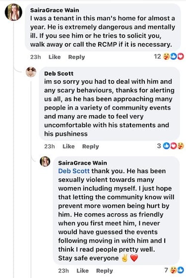 I found out pretty quickly that Saira had decided, on her own initiative, to slander, malign, and spread rumors, falsehoods, and outright lies about me -- going so far as to write a letter proclaiming I was a sexual predator, a danger to women and post it outside the local supermarket, Nester's, sometime in 2023.